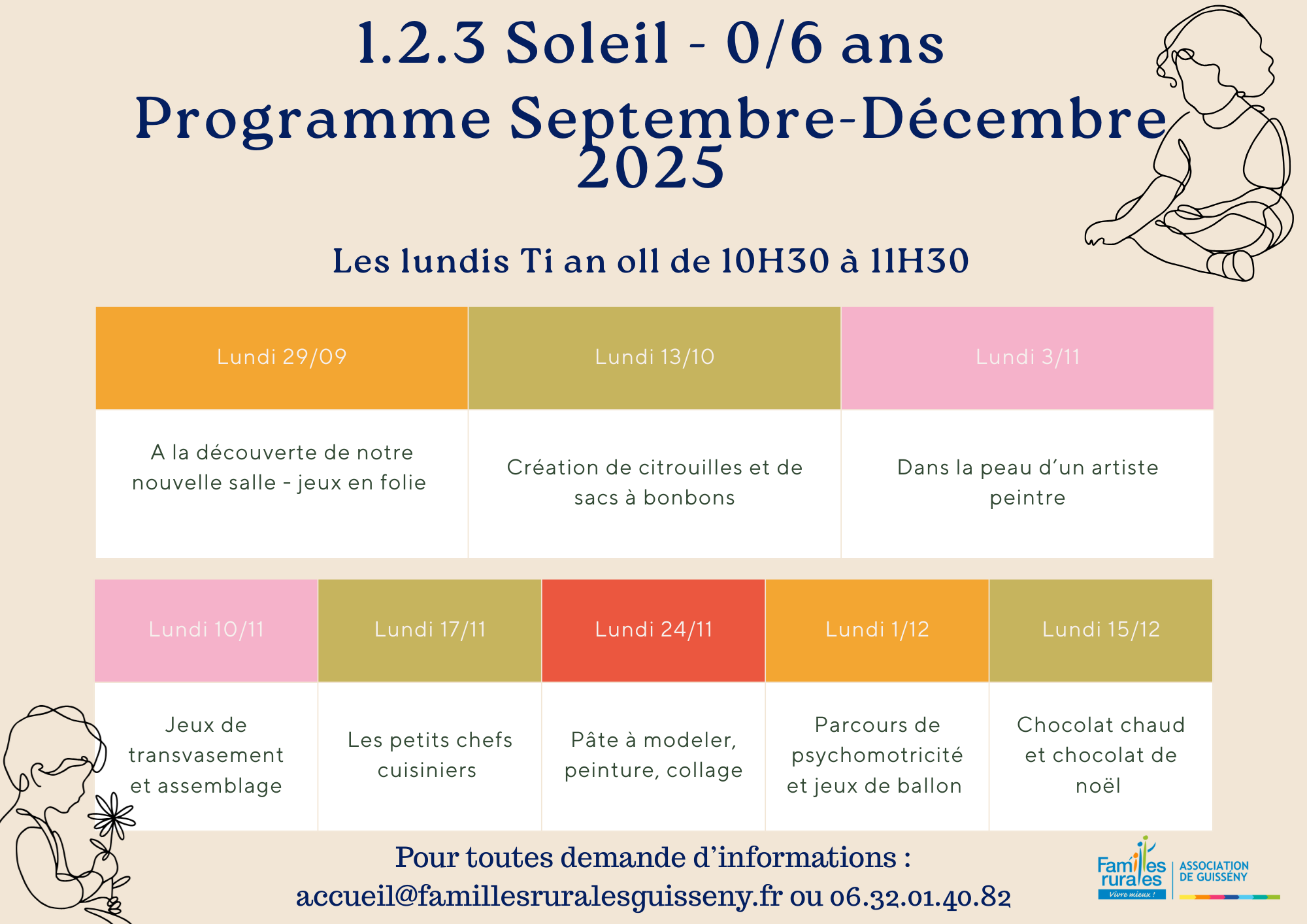 123 Soleil : reprise nouvel horaire 123 Soleil : reprise nouvel horaire Espace de Vie Sociale, Parentalité 123 Soleil : reprise nouvel horaire AFR Guisseny2025-09-26T11:03:24+02:00Catégories : Espace de Vie Sociale, Parentalité|
