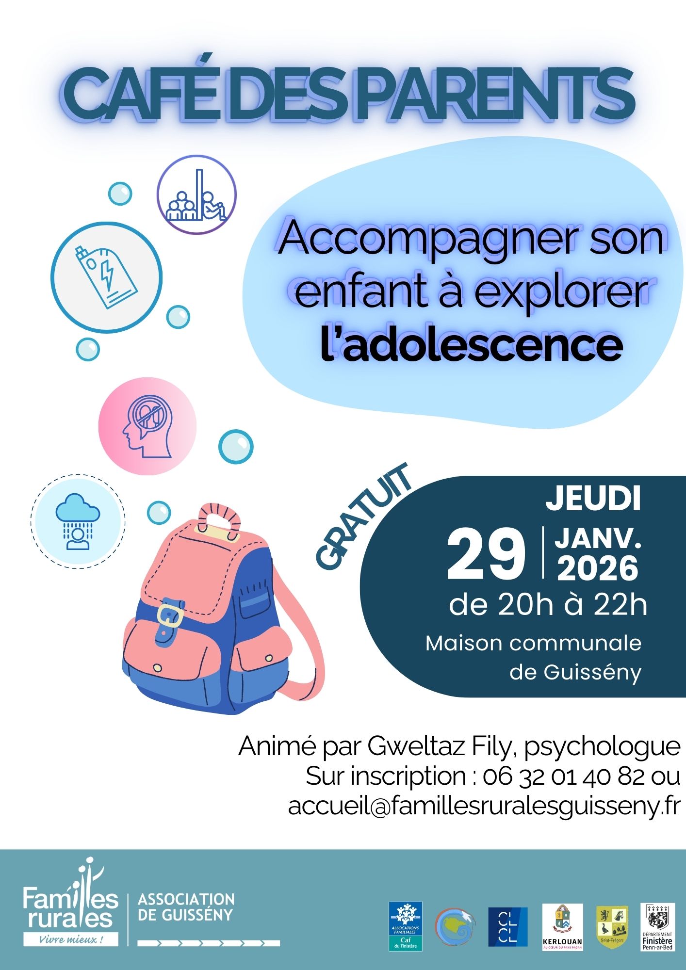| GratuitJeudi 29 janvier 2026, café des parents : accompagner son enfant à explorer l’adolescence. De 20h à 22h, venez échanger avec d’autres parents et discuter avec un professionnel. Animé par Gweltaz Fily, psychologue. Événement réservé aux parents. Gratuit, sur inscription : accueil@famillesruralesguisseny.fr ou 06 32 01 40 82.