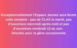 Exceptionnellement l'Espace Jeunes sera fermé cette semaine. Désolés pour la gêne occasionnée.