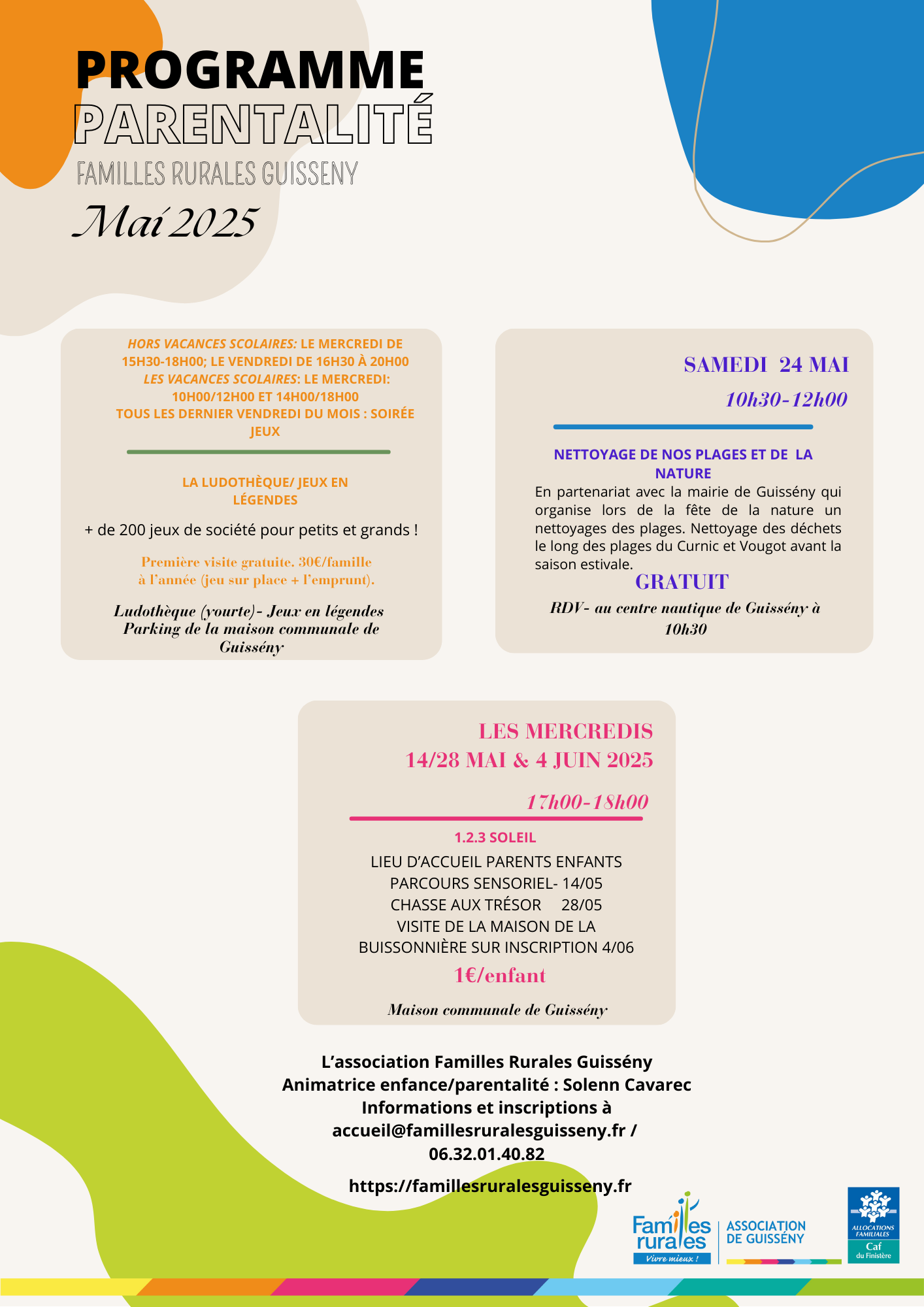 Programme Famille du mois de mai ! Programme Famille du mois de mai ! Parentalité Programme Famille du mois de mai ! AFR Guisseny2025-05-15T14:25:39+02:00Catégories : Parentalité|