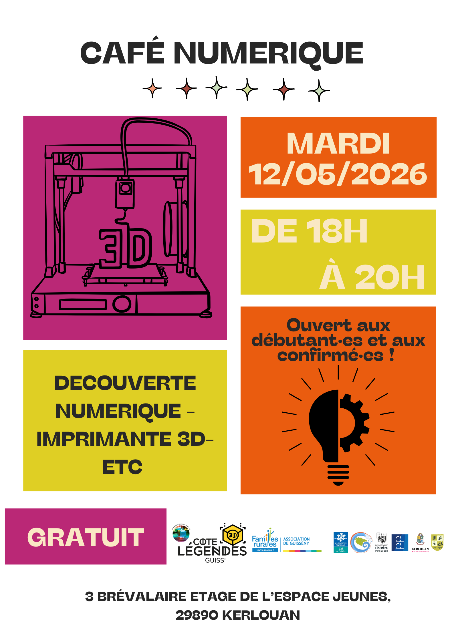 | GratuitLe prochain café numérique aura lieu le mardi 12 mai à 18h à Kerlouan (3 Brévalaire, à l’étage de l’Espace Jeunes). Vous avez un projet ? Envie de découvrir le fonctionnement de certaines machines (imprimante 3D, découpeuse vinyle, brodeuse numérique, casques de réalité virtuelle, …) ? N’hésitez pas à passer une tête ! Événement gratuit.