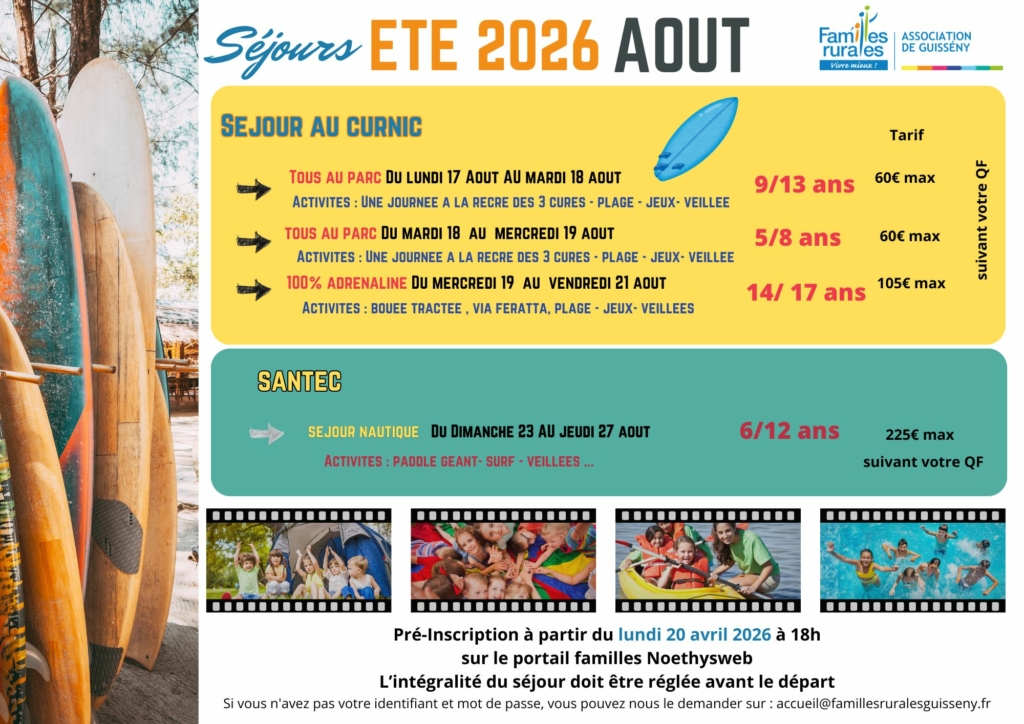 Plaquette séjours été 2026 AFR Guisseny2026-04-07T12:38:32+02:00Catégories : Séjours| Les pré inscriptions se feront en ligne sur le portail famille connecthys à partir du lundi 20 avril à 18h. Pour avoir vos codes de connexions merci d’envoyer un mail à l’accueil de l’association (accueil@famillesruralesguisseny.fr). Partager sur FacebookXWhatsAppEmail